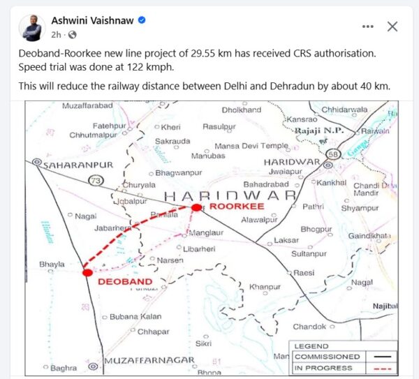 देहरादून : देवबंद-रुड़की नई रेलवे लाइन परियोजना की 29.55 किलोमीटर लंबाई को रेल संरक्षा आयुक्त (सीआरएस) की मंजूरी मिल गई है। इस खंड पर हाल ही में 122 किलोमीटर प्रति घंटे की रफ्तार से सफल स्पीड ट्रायल किया गया। इस नई लाइन के चालू होने से दिल्ली और देहरादून के बीच रेलवे की दूरी लगभग 40 किलोमीटर कम हो जाएगी, जिससे यात्रा समय में उल्लेखनीय कमी आएगी।