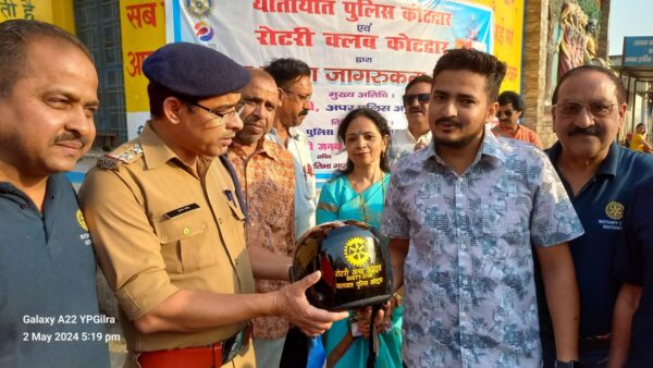 कोटद्वार । रोटरी क्लब कोटद्वार व यातायात पुलिस कोटद्वार संयुक्त तत्वावधान मे सड़क सुरक्षा जागरूकता अभियान के तहत 25 हैलमेट वितरित किए गए है । गुरुवार को तीलू रौतेला चौक में आयोजित अभियान का शुभारंभ अपर पुलिस अधीक्षक जया बलूनी ने किया । इस अवसर पर उन्होंने सड़क सुरक्षा के बारे मे जनता को जानकारी देते हुए कहा कि सभी दोपहिया वाहन चालक को हैलमेट पहनकर चलना चाहिए। यह आपके जीवन को बचाने में सहायक होता है । अध्यक्ष कुलदीप अग्रवाल ने कहा कि सभी जनता को यातायात के नियमो का पालन करना चाहिए उन्होंने कहा कि रोटरी क्लब कोटद्वार समय-समय पर सड़क सुरक्षा हेतु जागरूकता अभियान चलाता रहता है । इस अवसर पर वाईपी गिलरा, अनीत चावला, शरत चन्द्र गुप्ता, यातायात निरीक्षक जनक पंवार व विजय कुमार माहेश्वरी ने विचार व्यक्त किए । अभियान के तहत 25 बिना हैलमेट पहने दोपहिया वाहन चालको के चालन काटे गए तथा उनको क्लब की ओर से हैलमेट वितरित किए गए । कार्यक्रम के संयोजक ज्योति स्वरूप उपाध्याय व कार्यक्रम का संचालन सचिव प्रतिभा गुप्ता ने किया ।