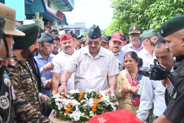 उन्होंने कहा आज तक का इतिहास है, कि आमने सामने की लड़ाई में पाकिस्तान कभी भारत से नहीं जीत सकता है। सैनिक कल्याण मंत्री ने कहा पाकिस्तान के इस कायराना हमले का बदला भारतीय सेना के जवान जरूर देंगे।उन्होंने कहा दुःख की इस घड़ी में सरकार शहीद परिवारवालों के साथ हमेशा खड़ी है। सैनिक कल्याण मंत्री गणेश जोशी ने प्रदेश के मुख्यमंत्री पुष्कर सिंह धामी की तरफ से भी शहीद को पुष्पचक्र अर्पित कर श्रद्धांजलि दी। इस अवसर पर कर्नल आरएस भंडारी, पीटीआर शमशेर सिंह बिष्ट, समाजसेवी ललित जोशी, सेना के अधिकारी, शहीद के परिजन सहित हज़ारो की संख्या में क्षेत्रवासी उपस्थित रहे।