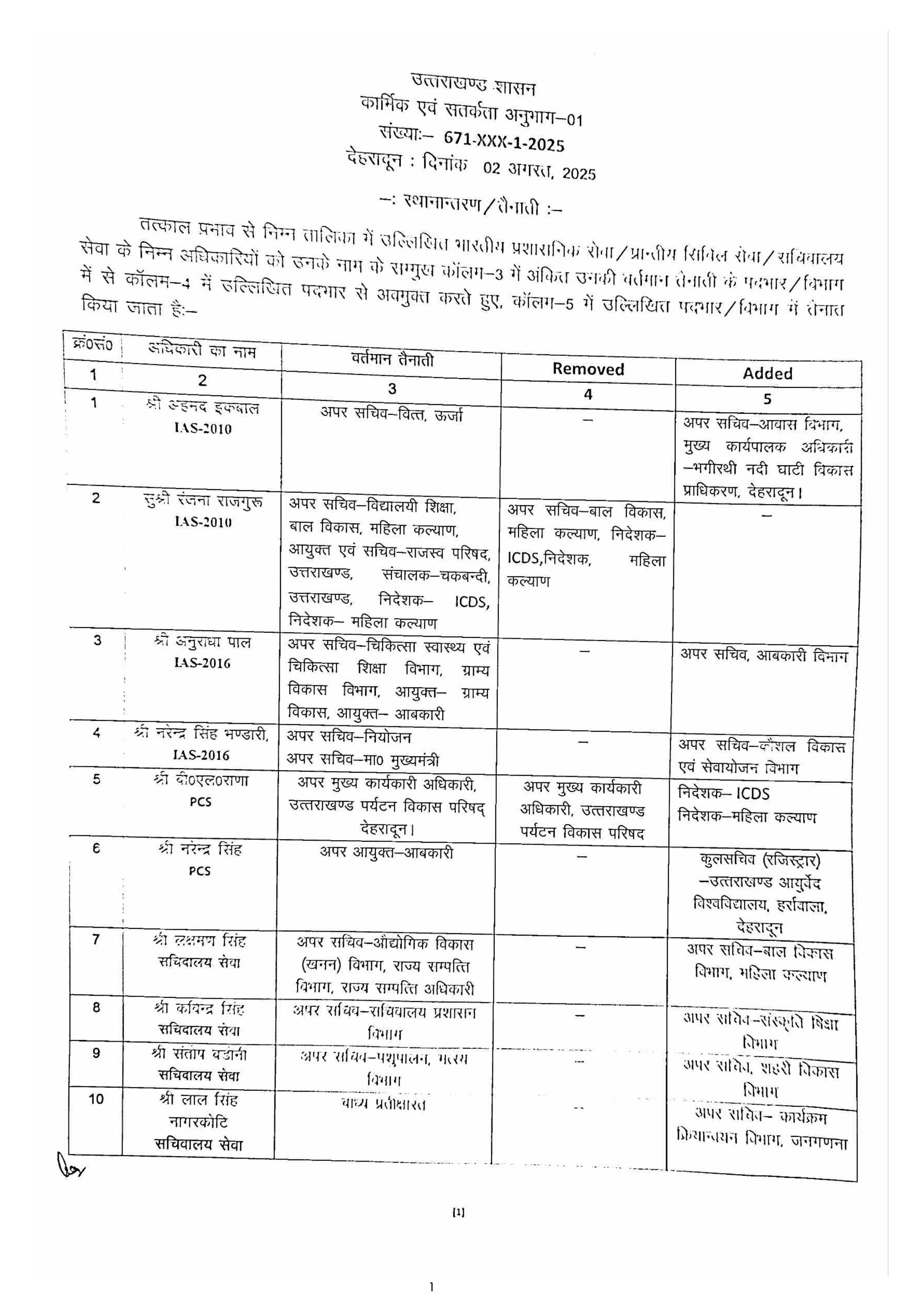 उत्तराखंड में IAS, PCS और सचिवालय सेवा के अधिकारियों के तबादले, देखिए पूरी सूचि ……. by August 3, 2025 written by August 3, 2025 Share 0FacebookTwitterPinterestWhatsapp देहरादून : उत्तराखंड शासन के कार्मिक एवं सतर्कता विभाग ने आईएएस, पीसीएस और सचिवालय सेवा के अधिकारियों की तबादला सूचि जारी की है। Share 0 FacebookTwitterPinterestWhatsapp