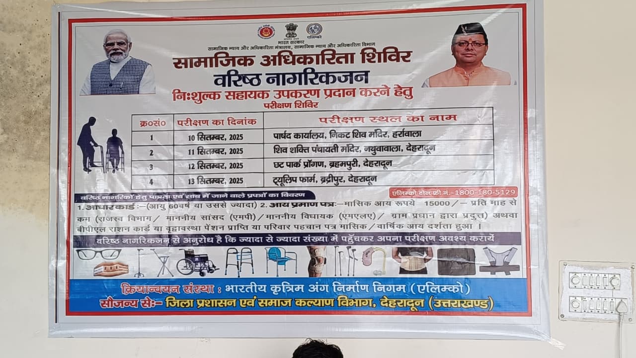 देहरादून : सामाजिक न्याय एवं अधिकारिता मंत्रालय भारत सरकार द्वारा संचालित वयोश्री योजना के अंतर्गत (आयु 60 वर्ष से अधिक) भारतीय कृत्रिम अंग निर्माण निगम कानपुर, जिला प्रशासन एवं जिला समाज कल्याण विभाग के सहयोग से पहले चरण में 10 सितंबर को स्थान पार्षद कार्यालय निकट शिव मंदिर हर्रावाला देहरादून मे शिविर आयोजित किया गया। शिविर में 120 वृद्धजनों का पंजीकरण किया गया। सभी चयनित 120 वृद्धजनों को आगामी 17 सितंबर को लॉर्ड वेंकटेश्वर वेडिंग पॉइंट, सुभाष रोड देहरादून में कृत्रिम अंगों का वितरण किया जाएगा। जिला समाज कल्याण अधिकारी दीपांकर घिल्डियाल ने बताया कि 11 सितंबर को नथुआवाला में भी इसी प्रकार के शिविर का आयोजन किया जाएगा।