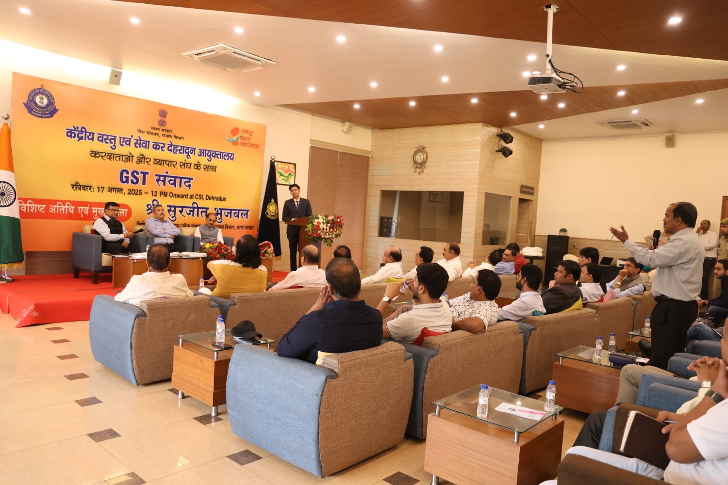 देहरादून : केंद्रीय वस्तु एवं सेवा कर (सीजीएसटी) आयुक्तालय, देहरादून द्वारा आज सिविल सर्विस इंस्टीट्यूट, देहरादून में ‘जीएसटी संवाद’ सत्र का आयोजन किया गया। यह कार्यक्रम करदाताओं और विभागीय अधिकारियों के बीच प्रत्यक्ष संवाद का एक प्रभावी मंच साबित हुआ। इस अवसर पर सुरजीत भुजबल, विशेष सचिव एवं सदस्य (सीमा शुल्क), केंद्रीय अप्रत्यक्ष कर एवं सीमा शुल्क बोर्ड (सीबीआईसी), नई दिल्ली मुख्य अतिथि के रूप में उपस्थित रहे। साथ ही संजय मंगल, मुख्य आयुक्त, सीजीएसटी एवं सीमा शुल्क, मेरठ जोन, तथा नीलेश कुमार गुप्ता, आयुक्त, सीजीएसटी (लेखा परीक्षा), देहरादून सहित अन्य वरिष्ठ अधिकारी भी कार्यक्रम में शामिल हुए।