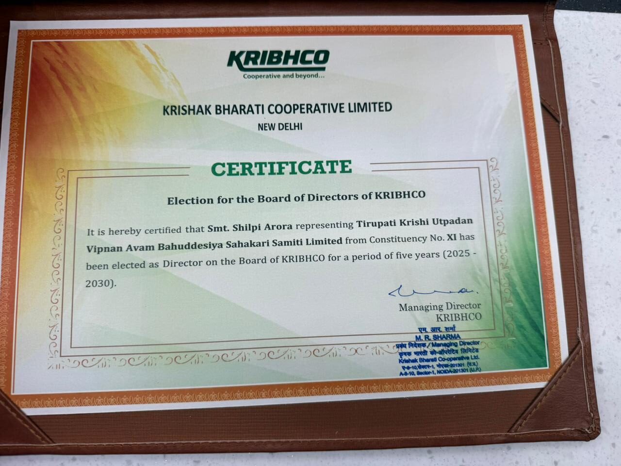 शिल्पी अरोड़ा पिछले बीस वर्षों से किसानों और महिलाओं के कल्याण के लिए सक्रिय रूप से कार्यरत हैं। किसान आंदोलन के दौरान वे ग़ाज़ीपुर बॉर्डर पर भी सक्रिय भूमिका में रही थीं और कृभको व नेफेड (NAFED) जैसे बड़े सहकारी संस्थानों के माध्यम से किसानों के हित में लगातार कार्य करती रही हैं। इसके अतिरिक्त, वे FICCI FLO उत्तराखंड की संस्थापक चेयरपर्सन रही हैं और पंजाबी महिला महासभा की प्रदेश अध्यक्ष के रूप में भी महिलाओं की उन्नति और सामाजिक कार्यों में अपनी अहम भूमिका निभा रही हैं। नव-नियुक्त अध्यक्ष सुधाकर चौधरी और उपाध्यक्ष डॉ. चंद्रपाल यादव को बधाई देते हुए, शिल्पी अरोड़ा ने कहा कि वे पूर्ण निष्ठा और समर्पण के साथ संस्था और किसानों के हित में अपना योगदान देती रहेंगी।