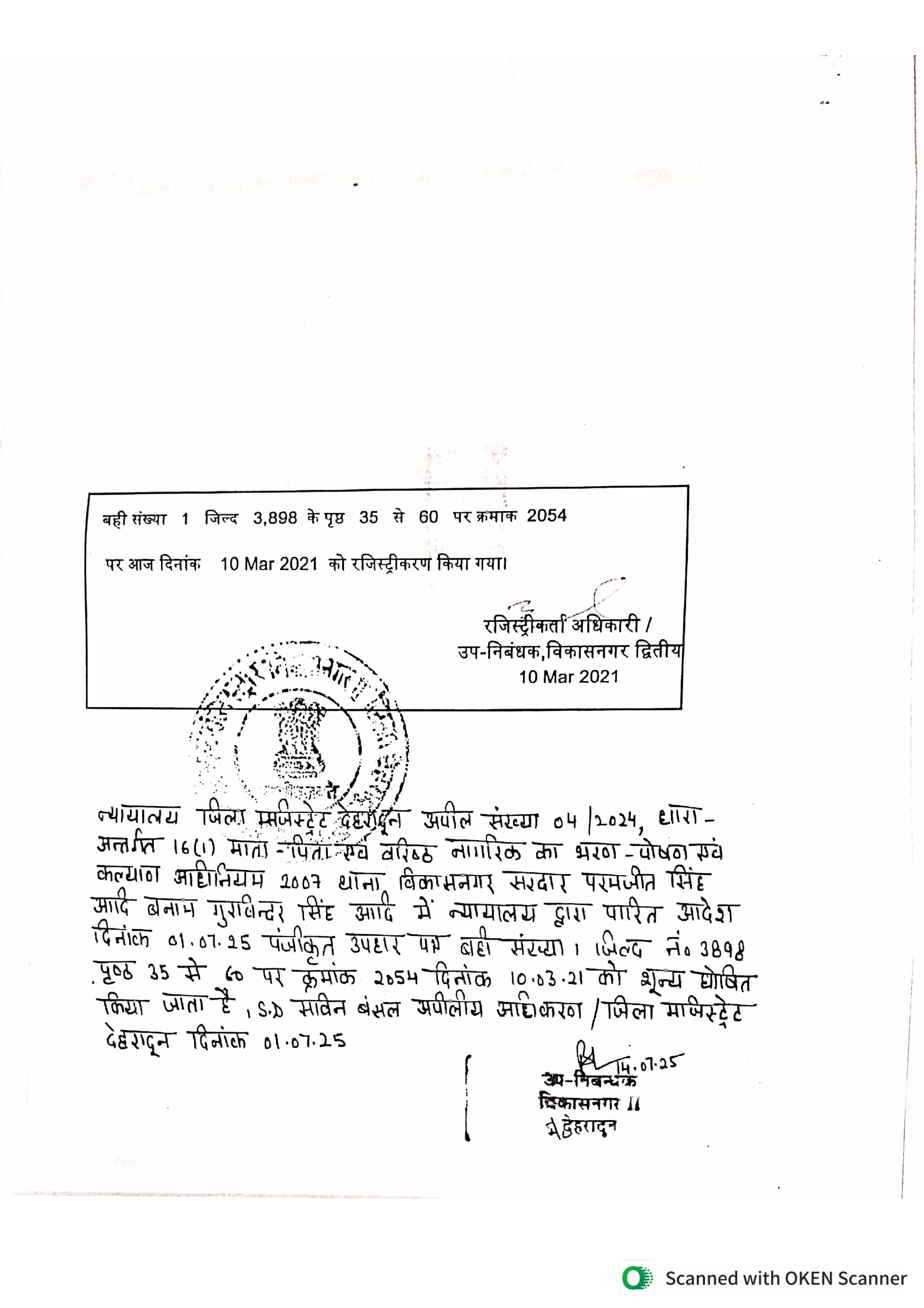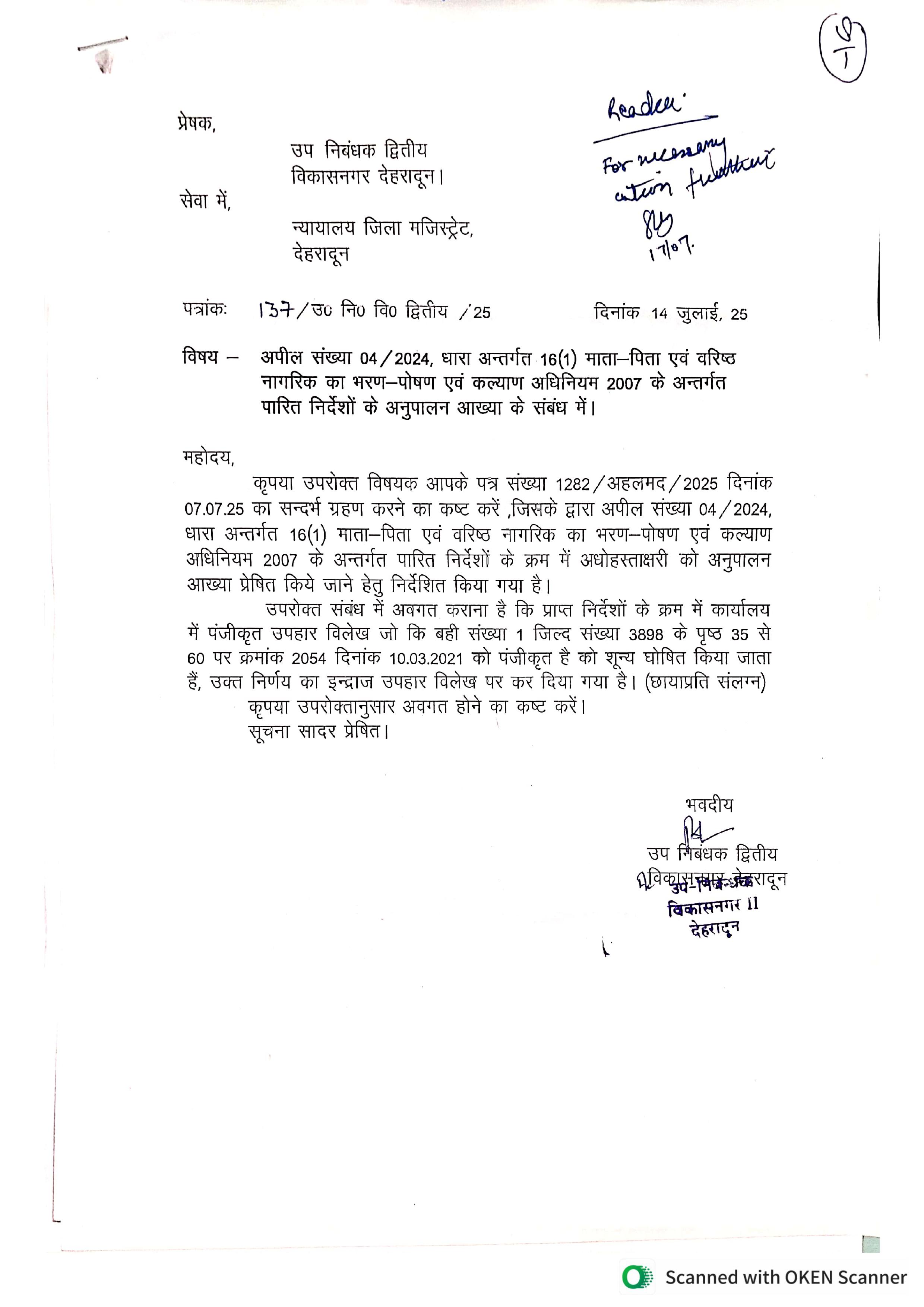 देहरादून : विगत दिवस डीएम ने बुजुर्ग दम्पति जिनके बेटे ने गिफ्ट डीड में सम्पति अपने नाम करवाकर बुजुर्ग माता-पिता को घर से बाहर कर दिया था। जिस डीएम ने अपने न्यायालय में पहली सुनवाई में ही गिफ्ट डीएड रद्द कर दी थी, डीएम  ने आदेशों के अनुपालन में रजिस्ट्री अनुपालन ओदश पास किया है। जिला प्रशासन देहरादून सामाजिक कर्तव्य से विमुख लोगों को अपनी न्याय प्रणाली से रास्ता दिखा रहा है वहीं असहाय जरूरतमंद लोंगों को त्वरित न्याय मिल रहा है। जिलाधिकारी सविन बसंल की कार्यप्रणाली सदैव असहाय, बुजुर्ग, महिला बच्चों, जनमानस के हित में रही है। असहाय जरूरतमंदो से जुड़े विषयों पर जिला प्रशासन द्वारा सक्रिय होकर त्वरित निर्णय लिए जा रहे हैं, जिससे जनमानस के प्रति जिला प्रशासन की प्रतिबद्धता कर्तव्यनिष्ठा दर्शाता है।
