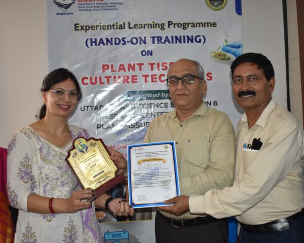 ऋषिकेश : प. ललित मोहन शर्मा श्रीदेव सुमन उत्तराखंड विश्वविद्यालय परिसर, ऋषिकेश में उत्तराखंड राज्य विज्ञान एवं अनुसंधान केंद्र (यूसर्क) के तत्वावधान में पादप उत्तक संवर्धन तकनीकी पर आधारित पांच दिवसीय हैंड्स ऑन ट्रेंनिंग का समापन हुआ। कार्यशाला समापन सत्र में बतौर मुख्य अतिथि यूसर्क के वरिष्ठ वैज्ञानिक डॉ. ओ पी नौटियाल ने कहा कि यूसर्क की हमेशा कोशिश रहती है कि प्रतिभागी प्रयोशालाओं में स्वयं से विज्ञान एवं प्रौद्योगिकी को सीखें व जानें।