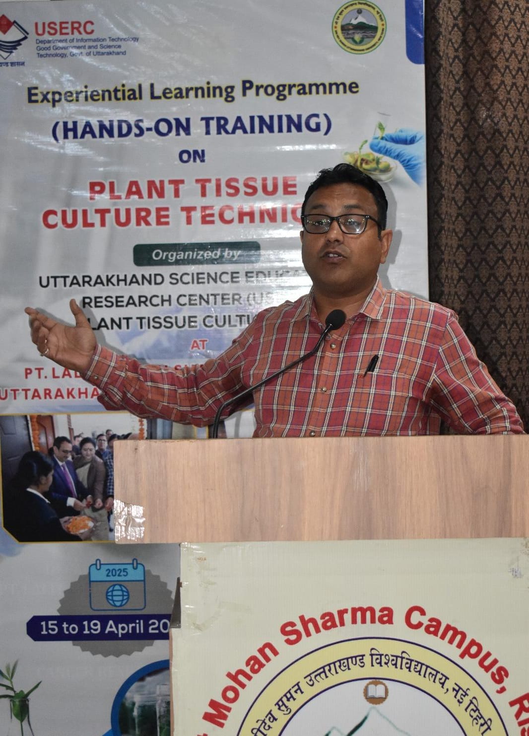 इस कार्यशाला में मुख्य सन्दर्भदाता व पादप उत्तक संवर्धन विषय विशेषज्ञ डॉ. मनीष देव शर्मा ने प्रतिभागियों को पादप ऊतक संवर्धन तकनीकियों के बारे में विस्तार पूर्वक बताया व पादप ऊतक संवर्धन द्वारा उद्यमिता पर जोर दिया, उन्होंने कहा कि पादप ऊतक संवर्धन तकनीक एक ऐसी विधि है जिसमे पौधो के ऊतकों को नियंत्रित परिस्थितियो मे उगाया जाता है और नए पौधों को उत्पन्न किया जाता है। यह तकनीक उद्यमिता के लिए कई अवसर प्रदान करती है। जैसे पौधो की वाणिज्यिक उत्पादन। पादप ऊतक संवर्धन तकनीक का उपयोग करके पौधो की वाणिज्यिक उत्पादन की जा सकती है, जैसे कि फूल, सब्जियां, और फल। नए पौधो की किस्मों का विकास, इस तकनीक का उपयोग करके नए पौधो की किस्मों का विकास किया जा सकता है, जो अधिक उत्पादक, रोग प्रतिरोधी और जलवायु परिवर्तन के प्रति सहनशील हो सकते हैं।