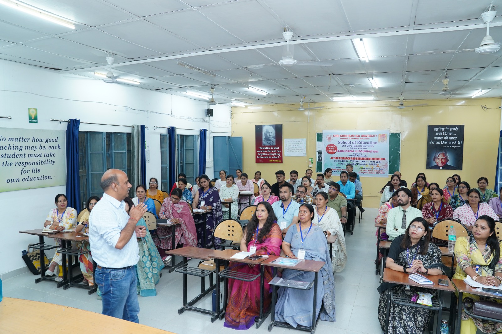 देहरादून : एसजीआरआर विश्वविद्यालय के शिक्षा संकाय द्वारा एसजीआरआर पब्लिक स्कूलों के शिक्षकों एवं शोध छात्रों के लिए ऐक्शन रिसर्च और रिसर्च मेथाडोलॉजी विषय पर अजीम प्रेमजी फाउंडेशन के सहयोग से 21 मई से 23 मई तक तीन दिवसीय कार्यशाला का सफलतापूर्वक आयोजन किया गया। इस कार्यशाला का उद्देश्य शिक्षकों को अनुसंधान की मूलभूत समझ प्रदान करना और कक्षा में सुधार हेतु चिंतनशील एवं व्यवस्थित दृष्टिकोण विकसित करना रहा। इस अवसर पर विश्वविद्यालय के प्रेसिडेंट श्रीमहंत देवेंद्र दास जी महाराज ने कार्यशाला के सफल आयोजन के लिए शुभकामनाएं प्रेषित की।