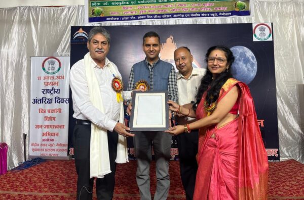 नैनीताल : पहले राष्ट्रीय अंतरिक्ष दिवस पर आयोजित चित्र प्रदर्शनी, विभिन्न प्रतियोगिताओं और जागरूकता कार्यक्रम की शुरुआत हो गई. केंद्रीय संचार ब्यूरो, नैनीताल की तरफ से आयोजित कार्यक्रम की शुरुआत DRDO के वरिष्ठ वैज्ञानिक डॉ पीएस नेगी, परिसर निदेशक प्रवीण बिष्ट, पूर्व कुलपति प्रोफ़ेसर जगत बिष्ट, प्रोफ़ेसर देव सिंह पोखरिया ने मिलकर किया. कार्यक्रम को सम्बोधित करते हुए प्रोफेसर शेखर जोशी ने कहा कि हमारा सपना है कि एक दिन अंतरिक्ष में उत्तराखंड का लोक पर्व हरेला मनाया जाय. उन्होंने चंद्रयान की सफलता पर बनी नखक्षत पेंटिंग केंद्रीय संचार ब्यूरो को भेंट की.