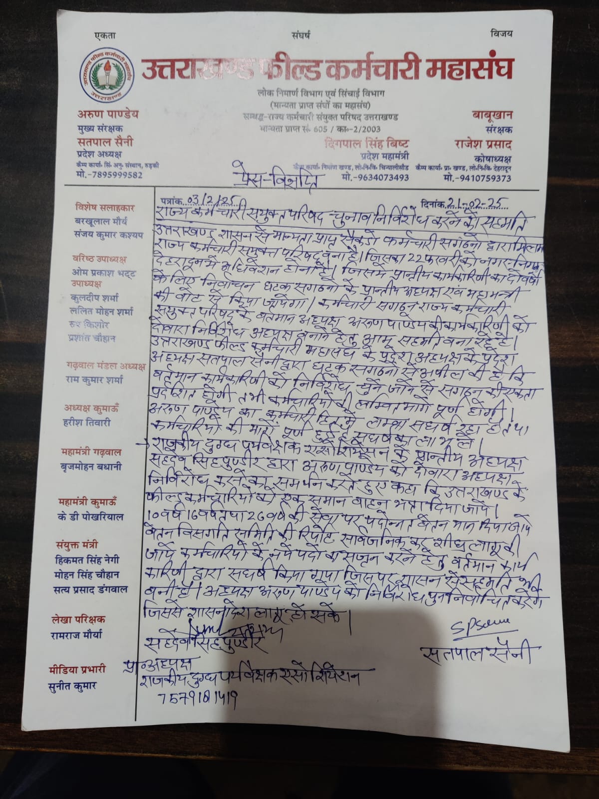 उत्तराखण्ड फिल्ड कर्मचारी महासंघ के प्रदेश अध्यक्ष सतपाल सैनी द्वारा घटक सगठनो से अपील की है कि वर्तमान कार्यकारिणी को निर्विरोध चुने जाने से सगठन की एकता प्रर्दशित होगी तभी कर्मचारियो की लम्बित मागे पूर्ण होगी अरुण पाण्डेय का कर्मचारी हित मे लम्बा संघर्ष रहा है तथा कर्मचारियो की मागे पूर्ण हुई है। पाण्डेय के संघर्ष का लाभ अध्यक्ष के रूप में ले ।