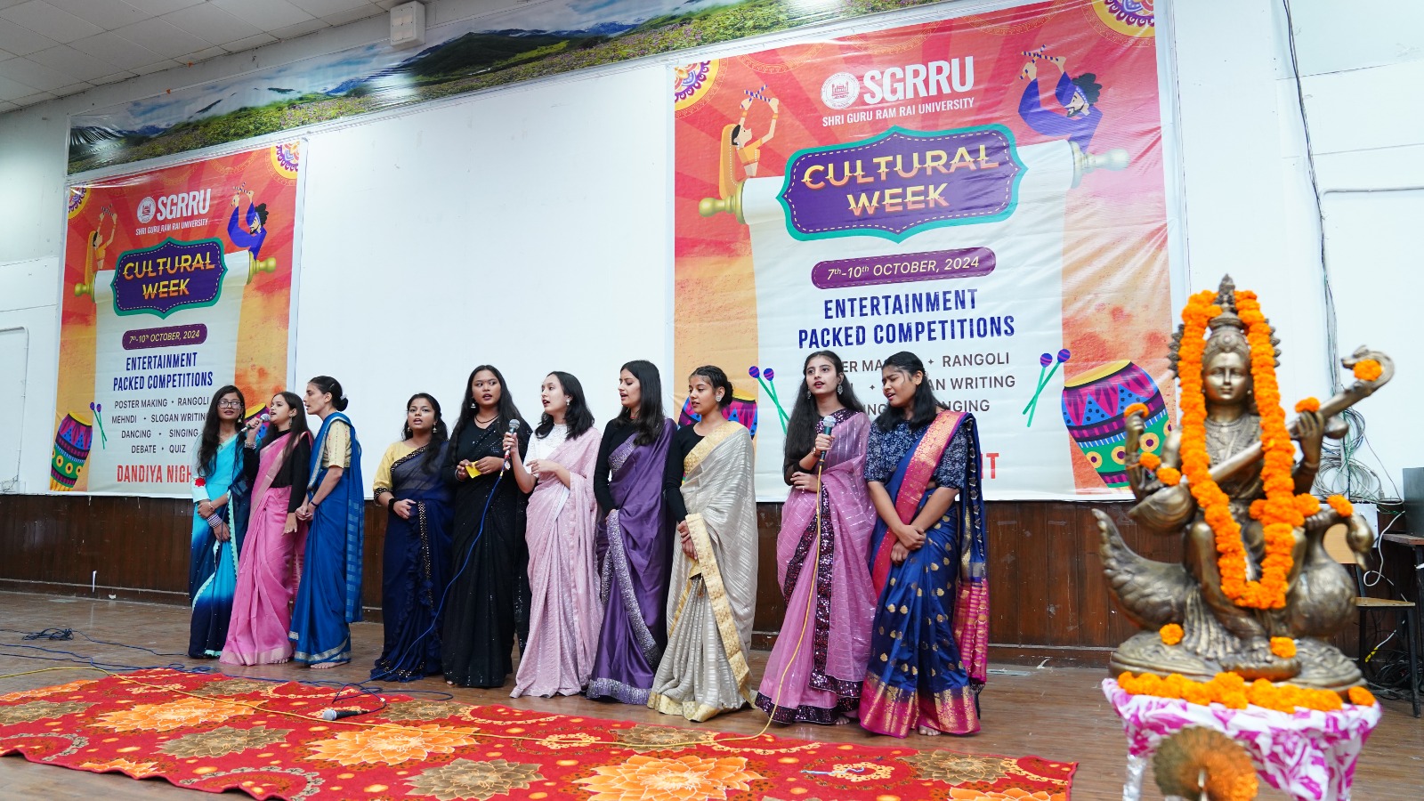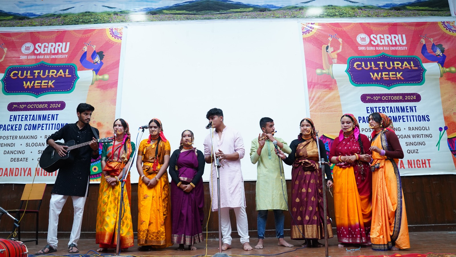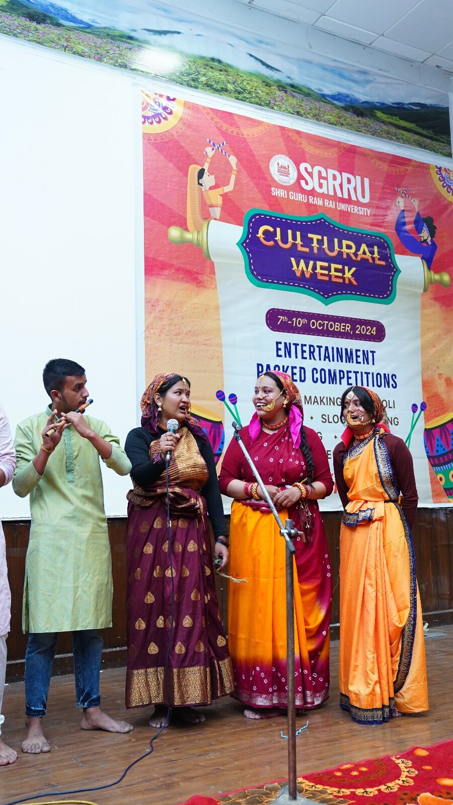 देहरादून। श्री गुरु राम राय विश्वविद्यालय के सांस्कृतिक सप्ताह के दूसरे दिन गीत संगीत की सुरलहरियां गूंजी। छात्र-छात्राओं ने एकल एवं समूह गायन से माहौल को सुरमई बना दिया। गीत संगीत का दौर देर शाम तक जारी रहा।  मंगलवार को श्री गुरु राम राय विश्वविद्यालय के ऑडिटोरिम में कार्यक्रम का शुभारंभ मां सरस्वती की वंदना के साथ शुरू हुआ। डाॅ .आशीष कुलश्रेष्ठ और डाॅ दीपक सोम ने दीप प्रज्जवलित कर कार्यक्रम की रूपरेखा प्रस्तुत की। एसजीआरआर विश्वविद्यालय के 11 संघटक स्कूलों के छात्र-छात्राओं ने एक से बढ़कर एक मनमोहक प्रस्तुतियां दीं।