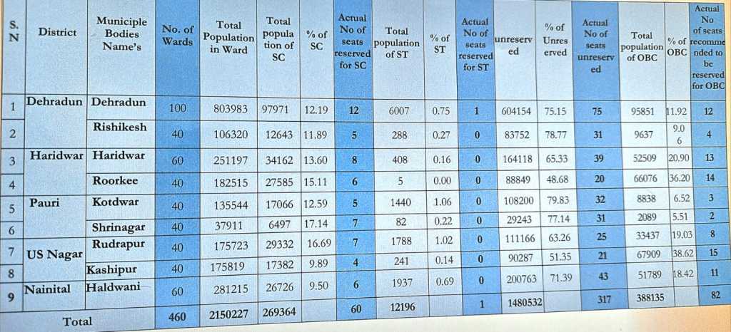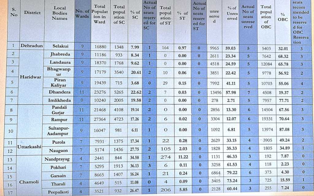 देहरादून: एकल सदस्यीय समर्पित आयोग के अध्यक्ष बी एस वर्मा ने प्रदेश भर के नगर निकायों का सर्वे पूरा कर शासन को अपनी रिपोर्ट सौंप दी है व शासन ने भी इस रिपोर्ट को स्वीकार कर लिया है। रिपोर्ट की माने तो आगामी नगर निकाय चुनाव अब नए तय किये गए आरक्षण के अनुसार होगा।