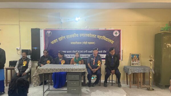 लैंसडाउन : भक्त दर्शन राजकीय स्नातकोत्तर महाविद्यालय जयहरीखाल में तीन दिवसीय रोवर्स रेंजर्स प्रशिक्षण कैंप का हुआ शुभारंभ l कार्यक्रम का शुभारंभ महाविद्यालय की प्राचार्य प्रो0 डॉ. लवनी आर राजवंशी एवं जिला प्रशिक्षक आयुक्त गाइड श्रीमती शांति रतूड़ी व जिला संगठन आयुक्त स्काउट श्री रूप चंद्र लखेडा द्वारा सरस्वती प्रतिमा पर दीप प्रज्ज्वलित कर किया गया l रोवर्स रेंजर्स छात्र- छात्राओ के द्वारा स्वागत गीत प्रस्तुत कर अथितियो का स्वागत किया l