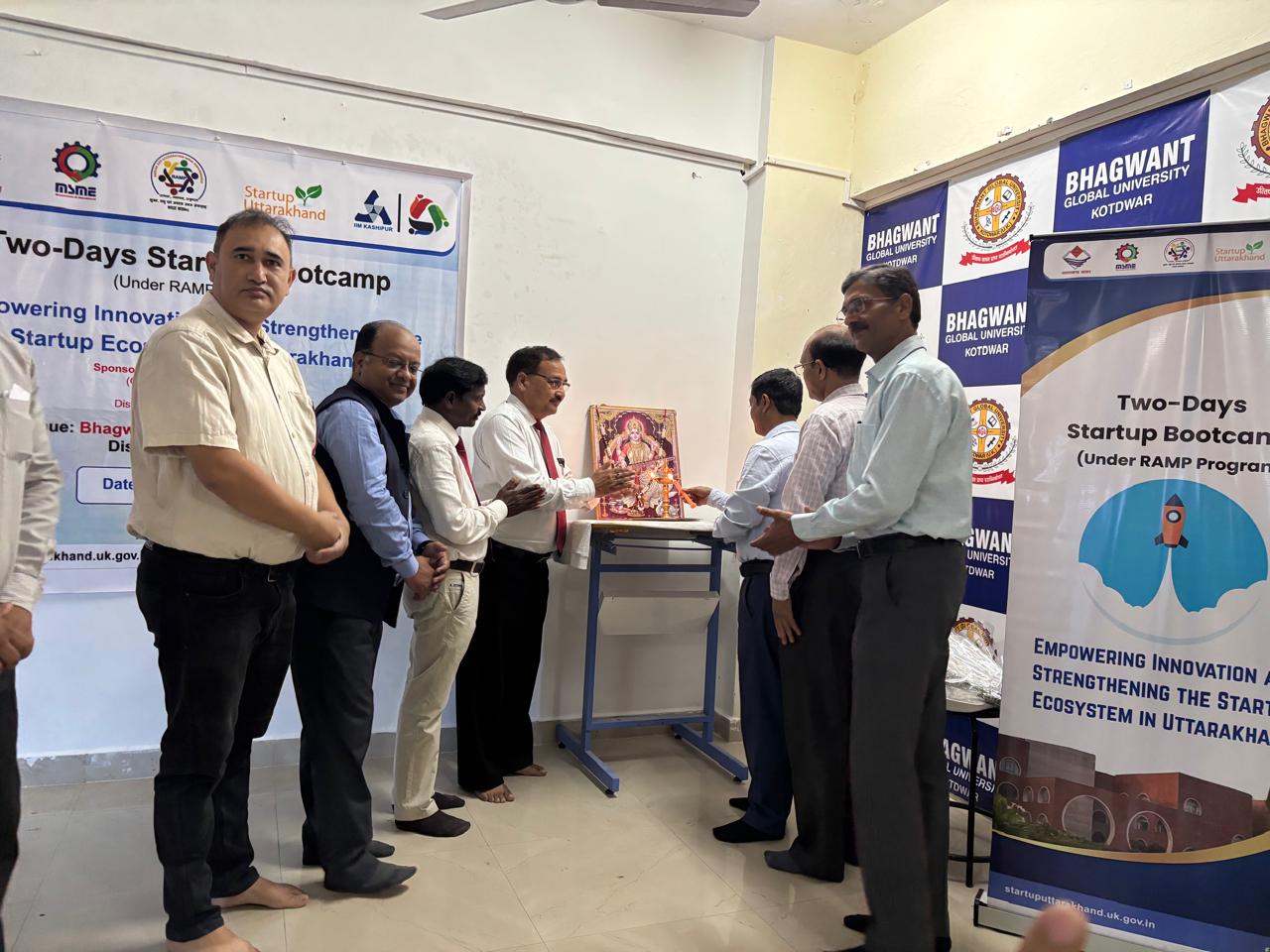 कोटद्वार : उत्तरी झण्डी चौड स्थित भगवन्त ग्लोबल विश्वविद्यालय में आईआईएम, जिला उद्योग केन्द्र, स्टार्टअप, उत्तराखण्ड सरकार के सहयोग से दो दिवसीय बूट कैंप का आयोजन किया गया। कार्यक्रम का आरम्भ जिला उद्योग केन्द्र के महा प्रबन्धक एसएन गर्ग, प्रोफे. जेपी साहू व विश्वविद्यालय के कुलपति प्रो. पीएस राणा द्वारा दीप प्रज्ज्वलित कर संयुक्त रूप से किया गया। तत्पश्चात विश्वविद्यालय के कुलपति प्रो. राणा द्वारा विश्वविद्यालय में पधारने हेतु अतिथियों का पुष्पगुच्छ देकर स्वागत किया गया।