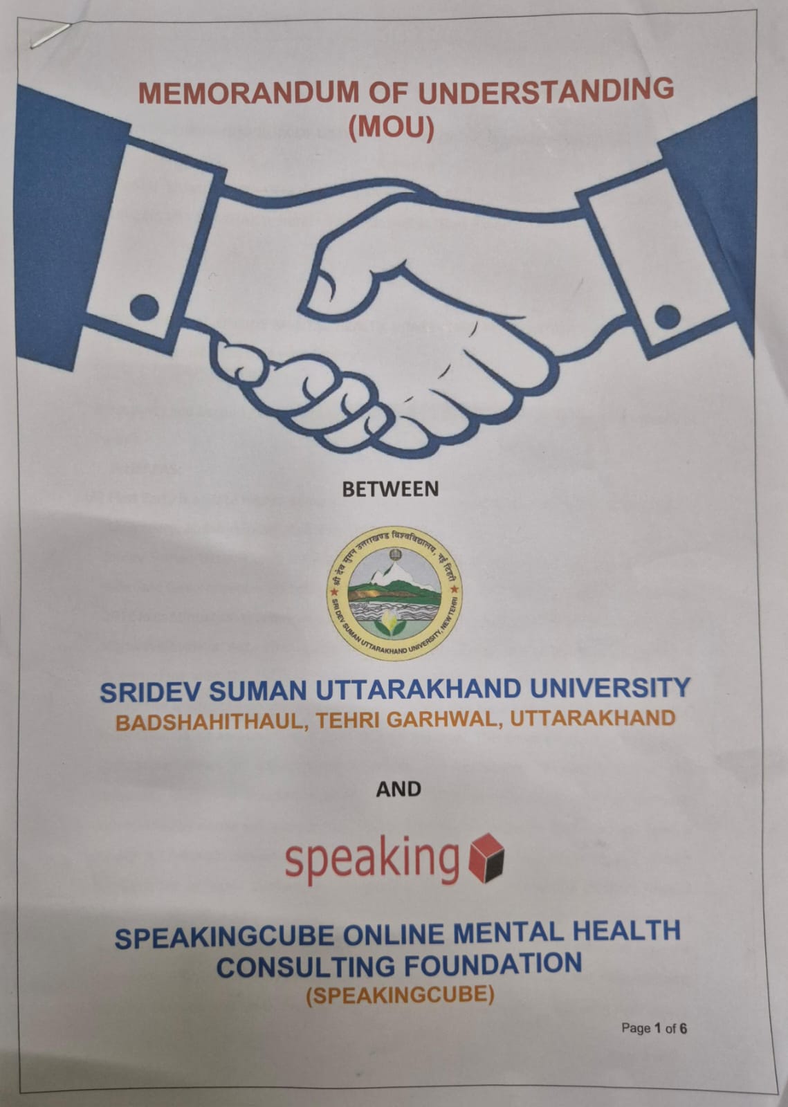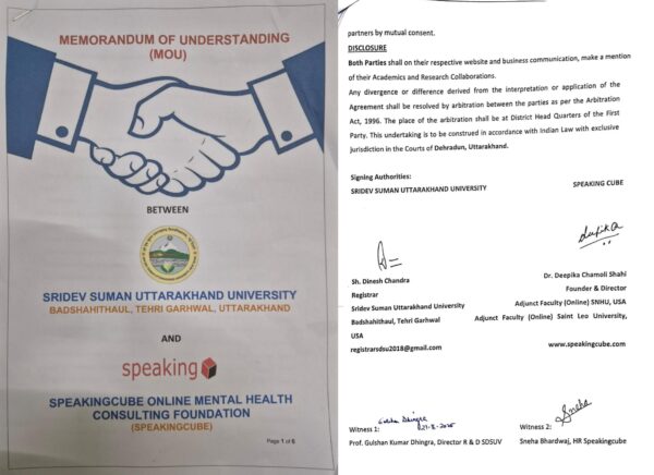 टिहरी : श्रीदेव सुमन उत्तराखंड विश्वविद्यालय, बादशाहीथौल, टिहरी गढ़वाल और स्पीकिंगक्यूब ऑनलाइन मेंटल हेल्थ कंसल्टिंग फाउंडेशन के बीच एक महत्वपूर्ण समझौता ज्ञापन (एमओयू) पर दिनांक 21 अगस्त 2025 को हस्ताक्षर किए गए। इस समझौते का उद्देश्य छात्रों और समाज में मानसिक स्वास्थ्य जागरूकता, शैक्षणिक शोध, और सामाजिक उद्यमिता को नई दिशा देना है।