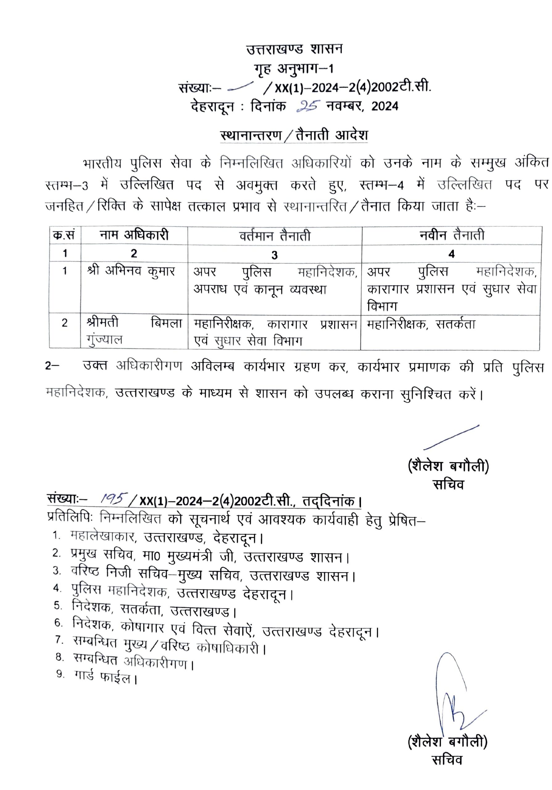 देहरादून : उत्तराखंड शासन ने पूर्व कार्यवाहक पुलिस महानिदेशक अभिनव कुमार सहित 02 आईपीएस अधिकारियों के स्थानान्तरण किये हैं. जिनमें आईपीएस अभिनव कुमार को अपर पुलिस महानिदेशक कारागार प्रशासन एवं सुधार सेवा विभाग दिया गया हैं. और इसके साथ ही आईपीएस बिमला गुंज्याल को महानिरीक्षक सतर्कता का दायित्व दिया गया हैं.