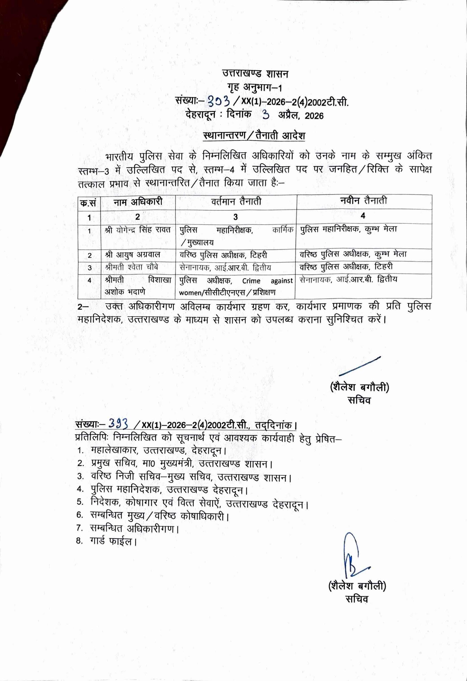 उत्तराखंड शासन ने IPS अधिकारियों के किये स्थानान्तरण, टिहरी के एसएसपी का भी हुआ ट्रांसफर, देखें सूचि by April 3, 2026 written by April 3, 2026 Share 0FacebookTwitterPinterestWhatsapp देहरादून : उत्तराखंड शासन ने IPS अधिकारियों के तदबाले किए हैं। इसमें टिहरी गढ़वाल के SSP का भी तबादला किया गया है। Share 0 FacebookTwitterPinterestWhatsapp