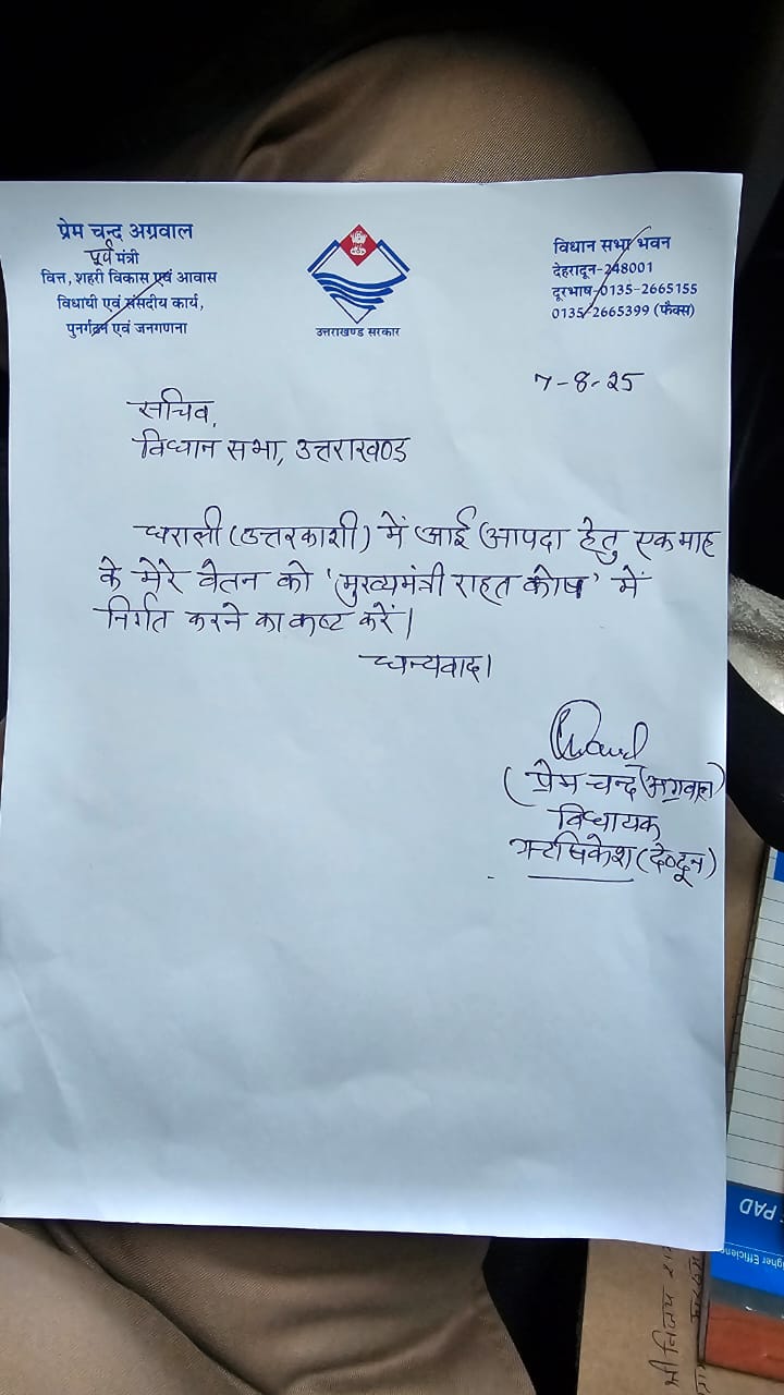 ऋषिकेश : पूर्व मंत्री डॉ प्रेम चंद अग्रवाल ने उत्तरकाशी जनपद के धराली गांव में आई आपदा के दृष्टिगत मुख्यमंत्री राहत कोष में अपने एक माह का वेतन देने की घोषणा की है। ऐसा करने पर पूर्व मंत्री डॉ प्रेमचंद अग्रवाल ने एक बार फिर यह जता दिया है कि उत्तराखंड और यहाँ के लोग उनके दिल में बसते हैं तथा यहाँ के लोगों की पीड़ा को अपना मानते हैं। इस अवसर पर डॉ अग्रवाल ने कहा है कि उत्तरकाशी के धराली गांव में आई भीषण आपदा से जन-धन की हानि अत्यंत दुखद एवं पीड़ादायक है।
