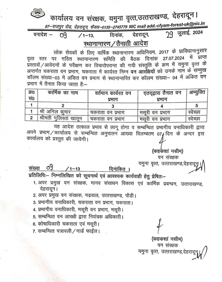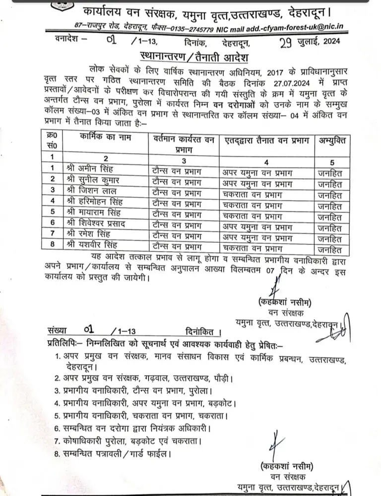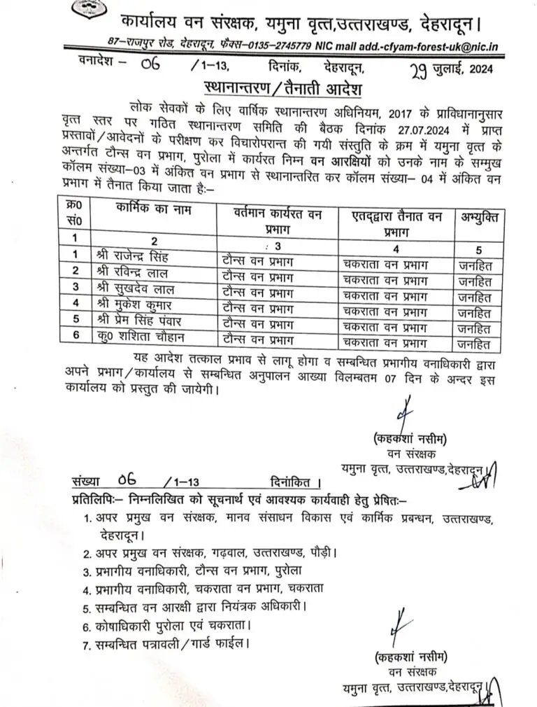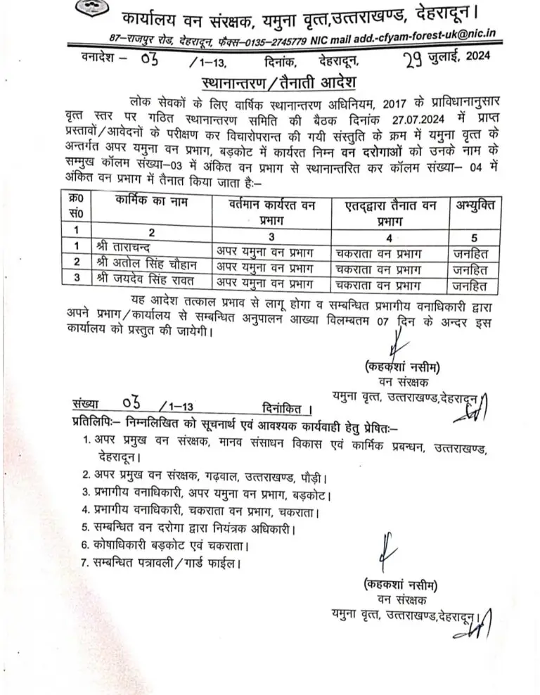 यमुना वृत के वन संरक्षक कहकशां नसीम ने एक साथ कई वन दरोगाओं और वन आरक्षियों के ट्रांसफर आदेश जारी किए हैं। सभी को तय समय में अपने नवीन तैनाती स्थल पर ज्वॉइन करने के निर्देश दिए गए हैं।