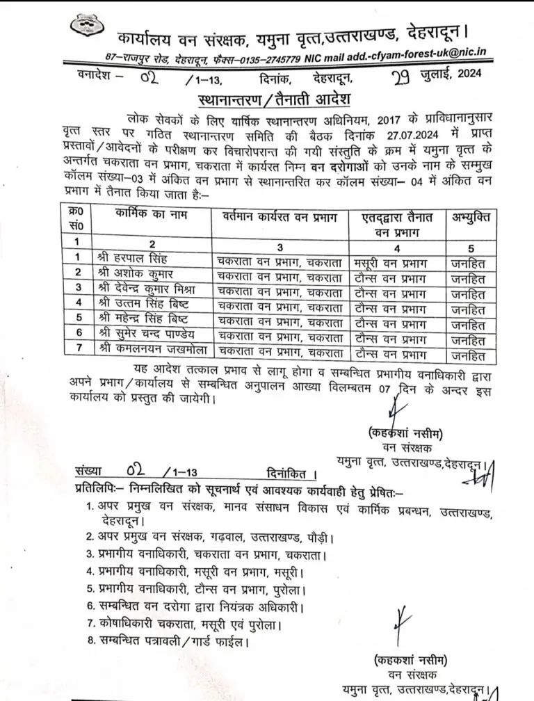 देहरादून : उत्तराखंड वन विभाग में पिछले कुछ दिनों से लगातार तबादलों का दौर जारी है। वन विभाग की लगभग सभी राज्यों के अधिकारियों और कर्मचारियों के तबादले किए जा रहे हैं।