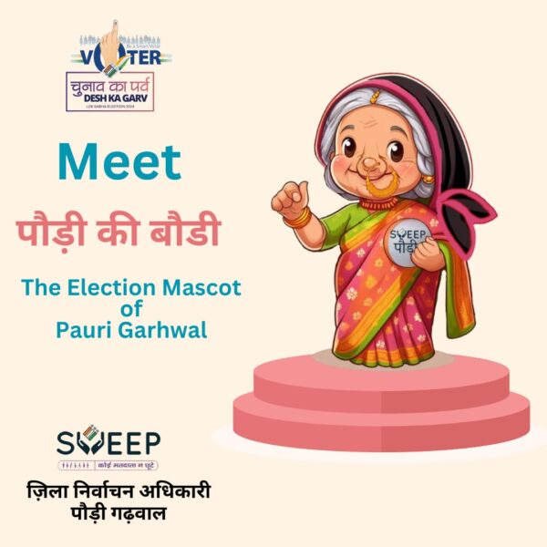 लोकसभा सामान्य निर्वाचन-2024 में इलैक्शन मैस्कॉट के रूप में ‘‘पौड़ी की बौडी’’ (ताई या गांव की बुजुर्ग महिला) का प्रतिरूप तैयार किया गया है। जैसा कि पहाडों के गांवों में गांव की कोई बुजुर्ग महिला जो गांव के सभी लोगों को ब्यवहारिक व सामाजिक ज्ञान देकर उनका पथ प्रदर्शित करती हैं तथा गांव के सामाजिक कार्यो व सरोकारों से जुडे़ मुद्दों से जुड़ने के लिए सभी को प्रेरित करती हैं।जनपद पौड़ी की इलैक्शन मैस्कॉट ‘‘पौड़ी की बौडी’’ के माध्यम से जिला प्रशासन द्वारा निर्वाचन के दौरान विभिन्न विषयों, मुद्दों तथा निर्वाचन के विभिन्न पहलुओं व अपडेट की जानकारी देने के लिए इस मैस्कॉट के माध्यम से स्थानीय गढ़वाली भाषा में क्रियेटिव पोस्टर, मीम्स और एनीमेटेड वीडियो तैयार कर प्रसारित किये जा रहे हैं। जिन्हें मतदाताओं द्वारा काफी पसंद भी किया जा रहा है।