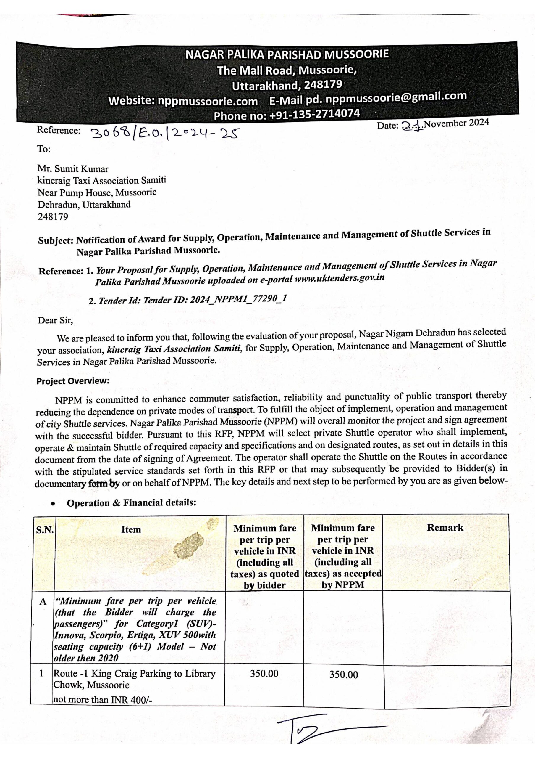 देहरादून : जिला प्रशासन के प्रयासों से मसूरी को अब जाम से सहूलियत मिलने जा रही है। मसूरी में शटल सेवा संचालन हेतु प्रक्रिया पूर्ण कर ली गई है। मसूरी में हाथीपावं एवं क्रिग्रेंग से शटल सेवा सचंालन हेतु नगर पालिका परिषद मसूरी द्वारा टैण्डर प्रक्रिया के उपरांत किंग्रेग टैक्सी एसोसिएशन का चयन किया गया है।