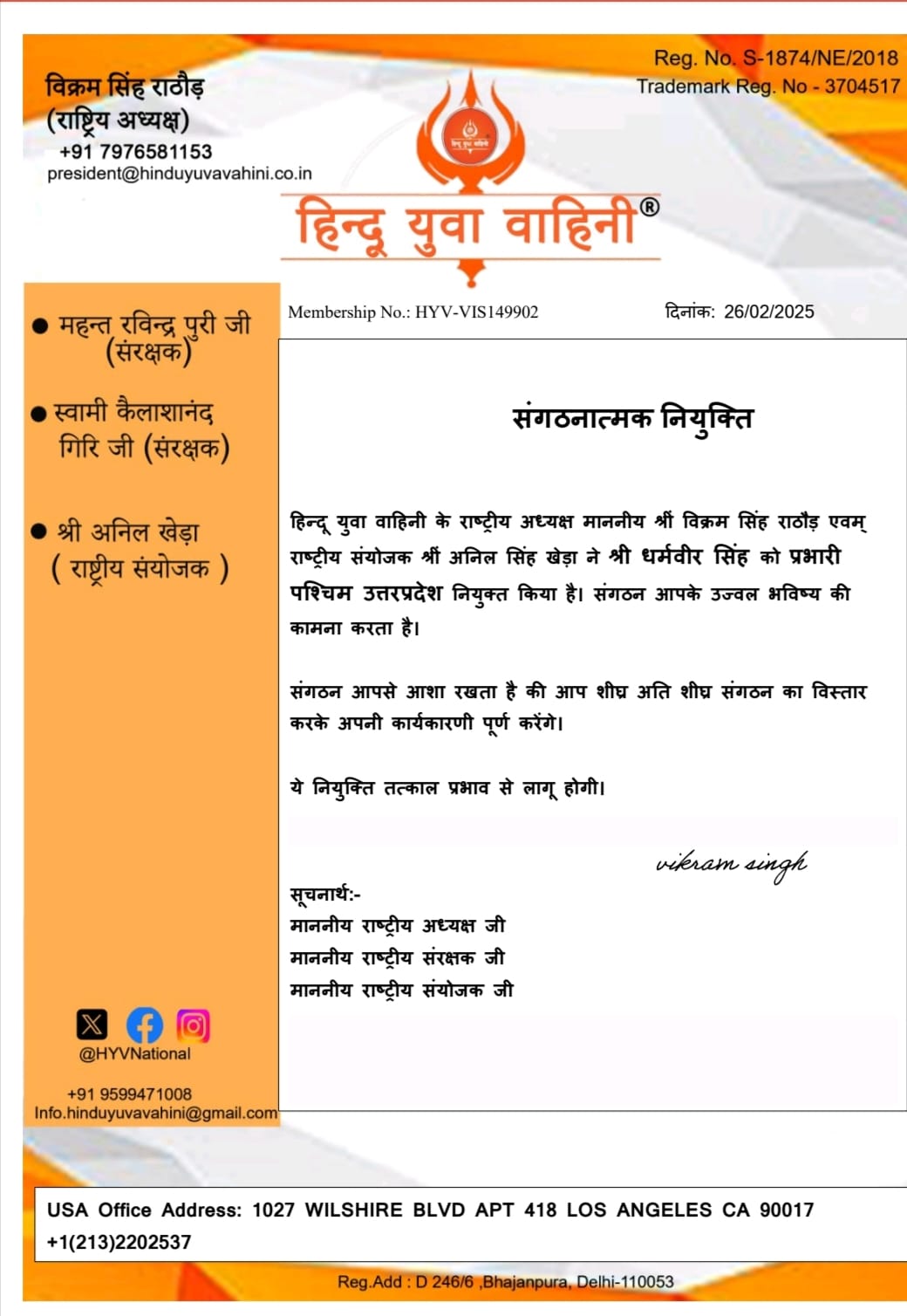 कोटद्वार/नई दिल्ली : हिन्दू युवा वाहिनी के राष्ट्रीय अध्यक्ष विक्रम सिंह राठौड़ एवं राष्ट्रीय संयोजक अनिल सिंह खेड़ा ने प्रख्यात हिंदूवादी नेता धर्मवीर सिंह गुसाईं को पश्चिम उत्तर प्रदेश का प्रभारी नियुक्त किया हैं. आपको बताते चले कि धर्मवीर सिंह गुसाईं विभिन्न पदों पर रहकर सनातन हिन्दू धर्म के लिए कार्य करते आ रहे हैं. पश्चिम उत्तर प्रदेश प्रभारी धर्मवीर सिंह गुसाईं ने हिन्दू युवा वाहिनी के राष्ट्रीय अध्यक्ष विक्रम सिंह राठौड़ एवं राष्ट्रीय संयोजक अनिल सिंह खेड़ा सहित केन्द्रीय नेतृत्व का आभार व्यक्त कर कहा कि वह संगठन के द्वारा दिए गये दायित्व को पूर्ण निष्ठां के साथ निभायेगे. और साथ ही कहा कि जल्द ही पश्चिम उत्तर प्रदेश में संगठन का विस्तार किया जाएगा.